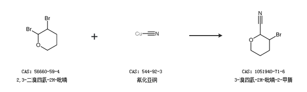 2.通过2,3-二溴四氢-2H-吡喃和氰化亚铜合成3-溴四氢-2H-吡喃-2-甲腈