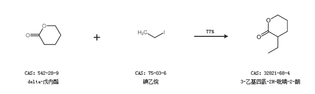 1.通过delta-戊内酯和碘乙烷合成3-乙基四氢-2H-吡喃-2-酮,收率约77%;