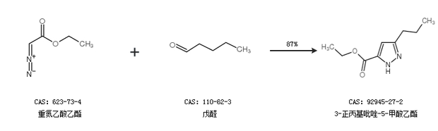 2.通过重氮乙酸乙酯和戊醛合成3-正丙基吡唑-5-甲酸乙酯,收率约87%;