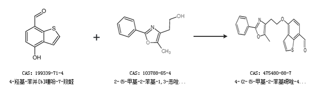 英文别名 4-[2-(5-methyl-2-phenyl-oxazol-4-yl)-ethoxy]-benzo[b]thiophen-7-carbaldehyde;Benzo[b]thiophene-7-carboxaldehyde,4-[2-(5-methyl-2-phenyl-4-oxazolyl)ethoxy];4-[2-(5-methyl-2-phenyl-4-oxazolyl)ethoxy]-benzo[b]thiophene-7-carboxaldehyde;4-[2-(5-methyl-2-phenyl-oxazol-4-yl)-ethoxy]-benzo[b]thiophene-7-carbaldehyde;