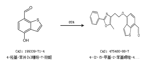 1.通过4-羟基-苯并[b]噻吩-7-羧醛合成4-(2-(5-甲基-2-苯基噁唑-4-基)乙氧基)苯并[b]噻吩-7-甲醛,收率约85%;