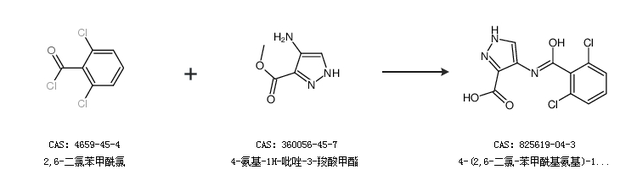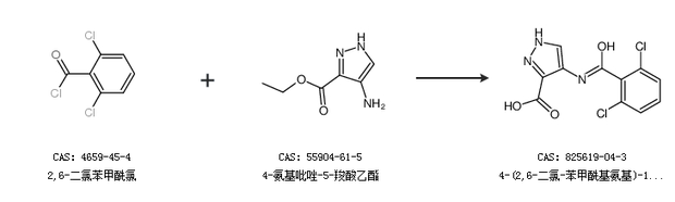 1.通过2,6-二氯苯甲酰氯和4-氨基吡唑-5-羧酸乙酯合成4-(2,6-二氯-苯甲酰基氨基)-1H-吡唑-3-羧酸
