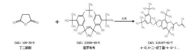 2.通过丁二酸酐和普罗布考合成4-(2,6-二-叔丁基-4-(2-(3,5-二-叔丁基-4-羟基苯基硫代)丙烷-2-基硫代)苯氧基)-4-氧代丁酸,收率约11%;