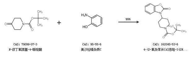 1.通过N-叔丁氧羰基-4-哌啶酮和美沙拉嗪杂质C合成4-(2-氧杂苯并[d]恶唑-3(2H)-基)哌啶-1-甲酸叔丁酯,收率约99%;