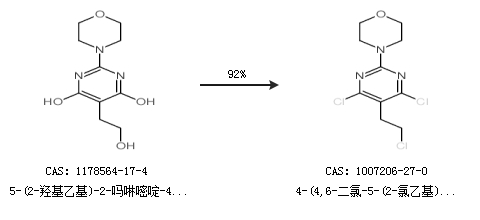1.通过5-(2-羟基乙基)-2-吗啉嘧啶-4,6-二醇合成4-(4,6-二氯-5-(2-氯乙基)嘧啶-2-基)吗啉,收率约92%;