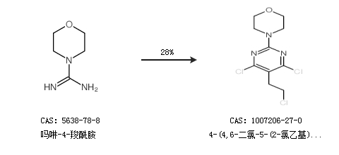 2.通过吗啉-4-羧酰胺合成4-(4,6-二氯-5-(2-氯乙基)嘧啶-2-基)吗啉,收率约28%;