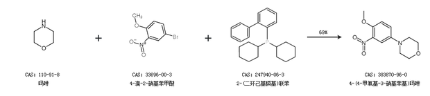 2.通过吗啉、4-溴-2-硝基苯甲醚和2-(二环己基膦基)联苯合成4-(4-甲氧基-3-硝基苯基)吗啉,收率约69%;