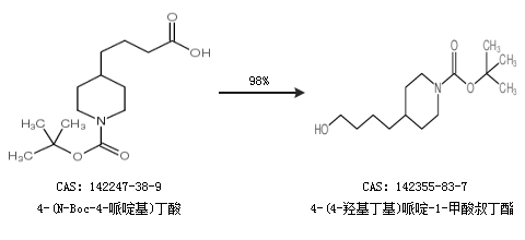 1.通过4-(N-Boc-4-哌啶基)丁酸合成4-(4-羟基丁基)哌啶-1-甲酸叔丁酯,收率约98%;