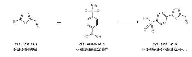 1.通过5-溴-2-呋喃甲醛和4-(氨基磺酰基)苯硼酸合成4-(5-甲酰基-2-呋喃基)苯-1-磺酰胺