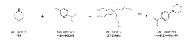2.通过吗啉、5-溴-2-硝基吡啶和四丁基碘化铵合成4-(6-硝基-3-吡啶)吗啉,收率约55%;