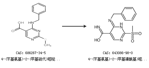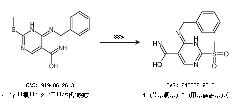 1.通过4-(苄基氨基)-2-(甲基硫代)嘧啶-5-羧酰胺合成4-(苄基氨基)-2-(甲基磺酰基)嘧啶-5-羧酰胺,收率约88%;