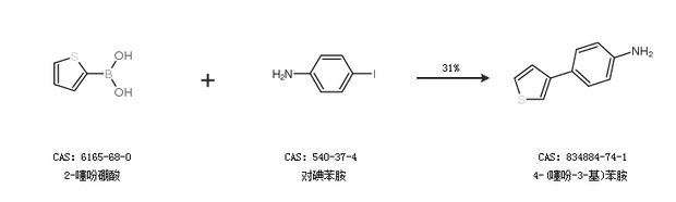1.通过2-噻吩硼酸和对碘苯胺合成4-(噻吩-3-基)苯胺,收率约31%;