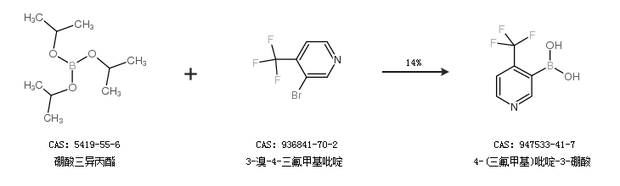 1.通过硼酸三异丙酯和3-溴-4-三氟甲基吡啶合成4-(三氟甲基)吡啶-3-硼酸,收率约14%;