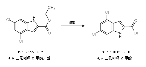 1.通过4,6-二氯吲哚-2-甲酸乙酯合成4,6-二氯吲哚-2-甲酸,收率约85%;