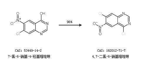 1.通过7-氯-6-硝基-4-羟基喹唑啉合成4,7-二氯-6-硝基喹唑啉,收率约96%;