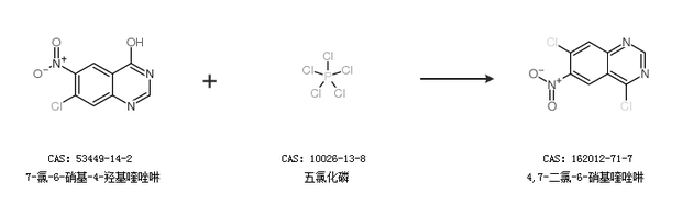 2.通过7-氯-6-硝基-4-羟基喹唑啉和五氯化磷合成4,7-二氯-6-硝基喹唑啉