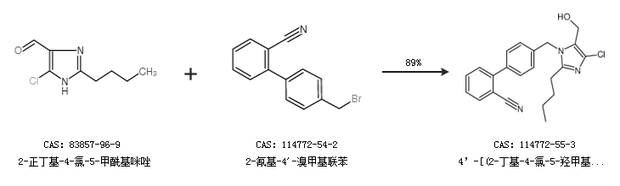 1.通过2-正丁基-4-氯-5-甲酰基咪唑和2-氰基-4''-溴甲基联苯合成4’-[(2-丁基-4-氯-5-羟甲基-1H-咪唑-1-基)甲基]-1,1’-联苯-2-甲腈,收率约89%;