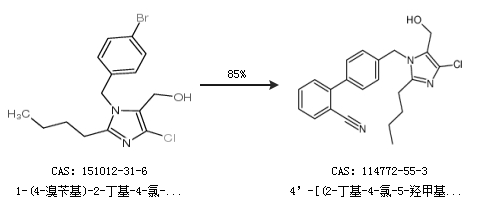 2.通过1-(4-溴苄基)-2-丁基-4-氯-1H-咪唑-5-甲醇合成4’-[(2-丁基-4-氯-5-羟甲基-1H-咪唑-1-基)甲基]-1,1’-联苯-2-甲腈,收率约85%;