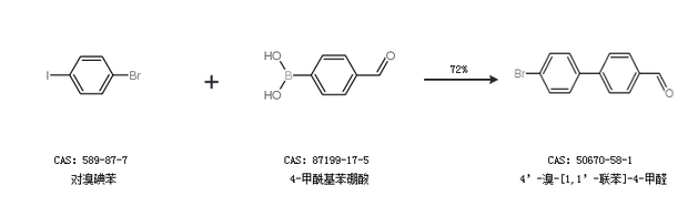 1.通过对溴碘苯和4-甲酰基苯硼酸合成4’-溴-[1,1’-联苯]-4-甲醛,收率约72%;