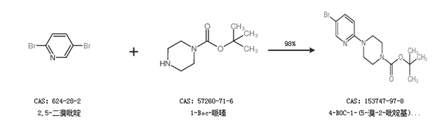 1.通过2,5-二溴吡啶和1-Boc-哌嗪合成4-BOC-1-(5-溴-2-吡啶基)哌嗪,收率约98%;