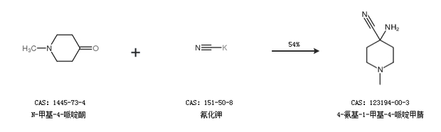 2.通过N-甲基-4-哌啶酮和氰化钾合成4-氨基-1-甲基-4-哌啶甲腈,收率约54%;
