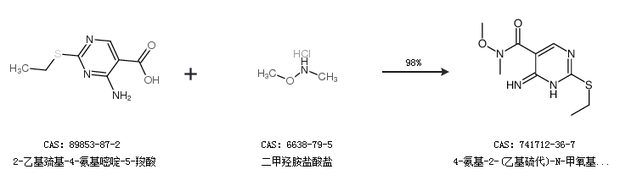 1.通过2-乙基巯基-4-氨基嘧啶-5-羧酸和二甲羟胺盐酸盐合成4-氨基-2-(乙基硫代)-N-甲氧基-N-甲基-5-嘧啶羧酰胺,收率约98%;