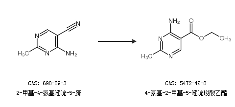 1.通过2-甲基-4-氨基嘧啶-5-腈合成4-氨基-2-甲基-5-嘧啶羧酸乙酯
