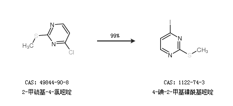 1.通过2-甲硫基-4-氯嘧啶合成4-碘-2-甲基磺酰基嘧啶,收率约99%;