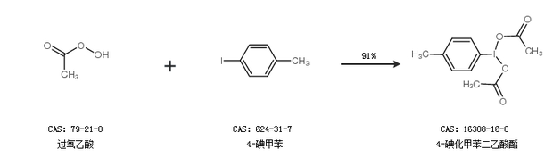 1.通过过氧乙酸和4-碘甲苯合成4-碘化甲苯二乙酸酯,收率约91%;