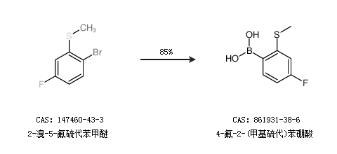 1.通过2-溴-5-氟硫代苯甲醚合成4-氟-2-(甲基硫代)苯硼酸,收率约85%;