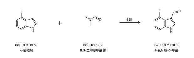 1.通过4-氟吲哚和N,N-二甲基甲酰胺合成4-氟吲哚-3-甲醛,收率约82%;