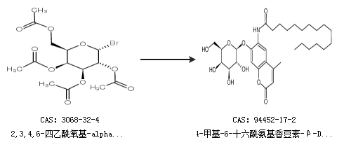 1.通过2,3,4,6-四乙酰氧基-alpha-D-吡喃糖溴化物合成4-甲基-6-十六酰氨基香豆素-β-D-吡喃半乳糖苷