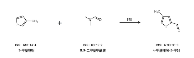 1.通过3-甲基噻吩和N,N-二甲基甲酰胺合成4-甲基噻吩-2-甲醛,收率约87%;
