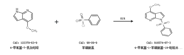 1.通过4-甲氧基-7-氮杂吲哚和苯磺酰氯合成4-甲氧基-1-苯磺酰基-1H-吡咯并[2,3-b]吡啶,收率约81%;