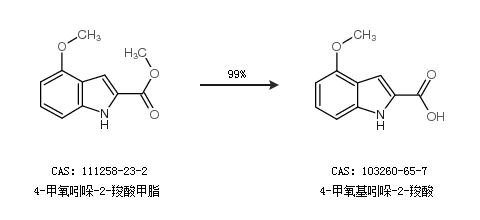 1.通过4-甲氧吲哚-2-羧酸甲脂合成4-甲氧基吲哚-2-羧酸,收率约99%;