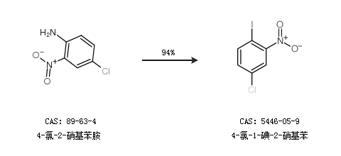 1.通过4-氯-2-硝基苯胺合成4-氯-1-碘-2-硝基苯,收率约94%;