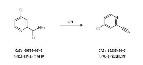 2.通过4-氯吡啶-2-甲酰胺合成4-氯-2-氰基吡啶,收率约92%;