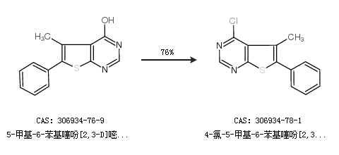 1.通过5-甲基-6-苯基噻吩[2,3-D]嘧啶-4-醇合成4-氯-5-甲基-6-苯基噻吩[2,3-D]嘧啶,收率约76%;