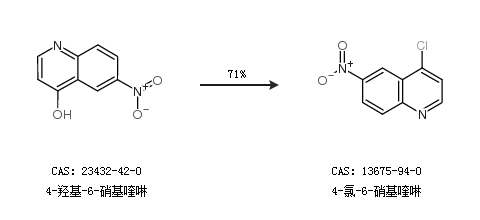 1.通过4-羟基-6-硝基喹啉合成4-氯-6-硝基喹啉,收率约71%;