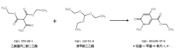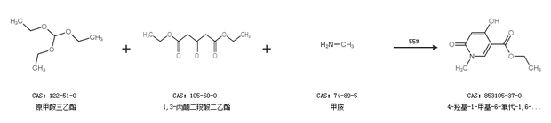 1.通过原甲酸三乙酯、1,3-丙酮二羧酸二乙酯和甲胺合成4-羟基-1-甲基-6-氧代-1,6-二氢-吡啶-3-羧酸乙酯,收率约55%;