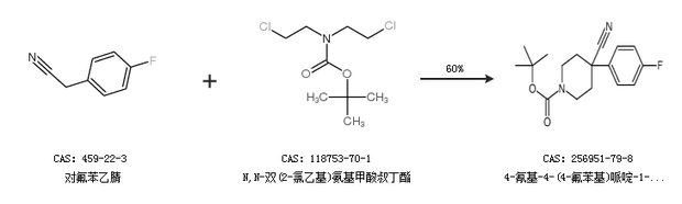 1.通过对氟苯乙腈和N,N-双(2-氯乙基)氨基甲酸叔丁酯合成4-氰基-4-(4-氟苯基)哌啶-1-羧酸叔丁酯,收率约60%;
