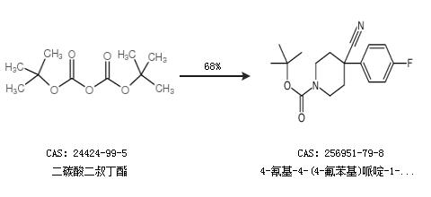 2.通过二碳酸二叔丁酯合成4-氰基-4-(4-氟苯基)哌啶-1-羧酸叔丁酯,收率约68%;