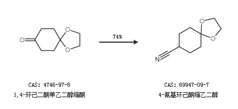 1.通过1,4-环己二酮单乙二醇缩酮合成4-氰基环己酮缩乙二醇,收率约74%;