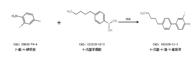 1.通过2-氟-4-碘苯胺和4-戊基苯硼酸合成4-戊基-4-溴-3-氟联苯,收率约35%;