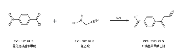 1.通过氯化对硝基苯甲酰和氰乙酸合成4-硝基苯甲酰乙腈,收率约52%;