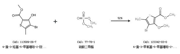1.通过4-溴-3-羟基-5-甲基噻吩-2-羧酸甲酯和硫酸二甲酯合成4-溴-3-甲氧基-5-甲基噻吩-2-羧酸甲酯,收率约52%;