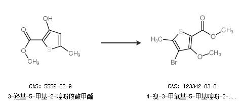 2.通过3-羟基-5-甲基-2-噻吩羧酸甲酯合成4-溴-3-甲氧基-5-甲基噻吩-2-羧酸甲酯