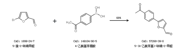 1.通过5-溴-2-呋喃甲醛和4-乙酰基苯硼酸合成5-(4-乙酰苯基)-呋喃-2-甲醛,收率约68%;