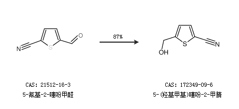 1.通过5-氰基-2-噻吩甲醛合成5-(羟基甲基)噻吩-2-甲腈,收率约87%;
