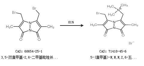 1.通过3,5-双溴甲基-2,6-二甲基吡唑并[1,2-a]吡唑-1,7-二酮合成5-(溴甲基)-N,N,N,2,6-五甲基-1,7-二氧代-1H,7H-吡唑并[1,2-A]吡唑-3-甲基溴化铵,收率约81%;